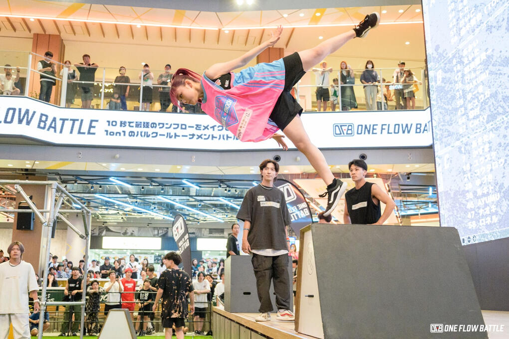 One Flow Battle is a series of 1 vs 1 parkour flow battles in the style of breakdance or MC head-to-head battles. The athletes have 10 seconds to do their best movements and are compared against each other directly in that battle only. It is a tournament format where the winner advances to the next round, and the loser is eliminated from the contest.